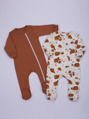 Один комбинезон из однотонного интерлока, второй из набивного. Они отлично гармонируют друг с другом и отлично впишутся в детскую комнату. КомбинезоныЦвет: какао/серый, какао/терракот, барашки/капучино, ламы/капучино, розочки/розовый, машинки/голубой