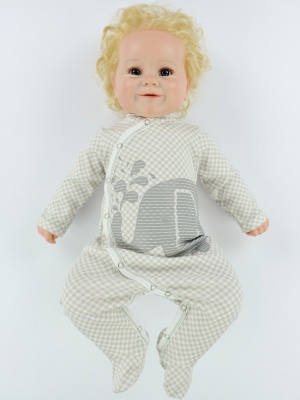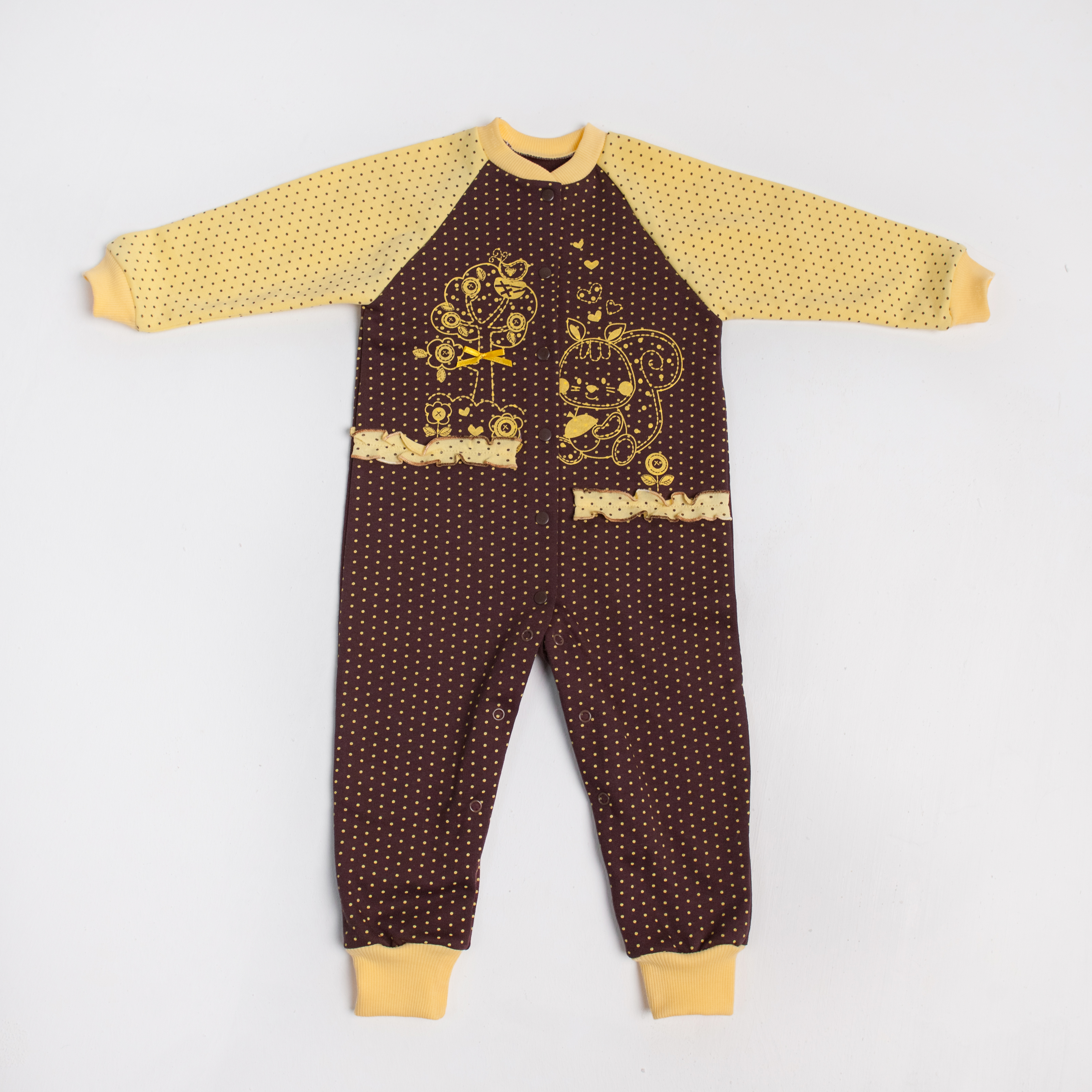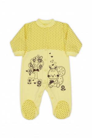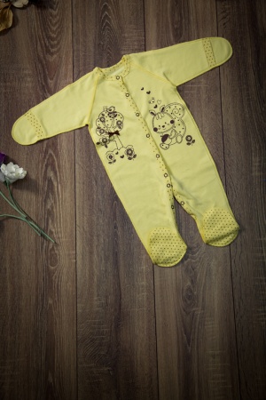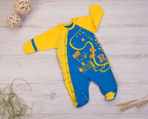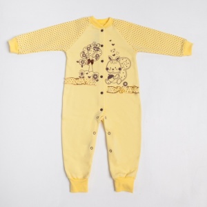 Комбинезон из интерлока 100% хлопок свободного силуэта. Рукав «реглан», длинный, заканчивающийся цельнокроеной рукавичкой. Все швы выполнены на лицевую сторону. Застежка спереди на кнопки, переходит в застежку в шаговом шве. КомбинезоныЦвет: желтый, коралл, персик
