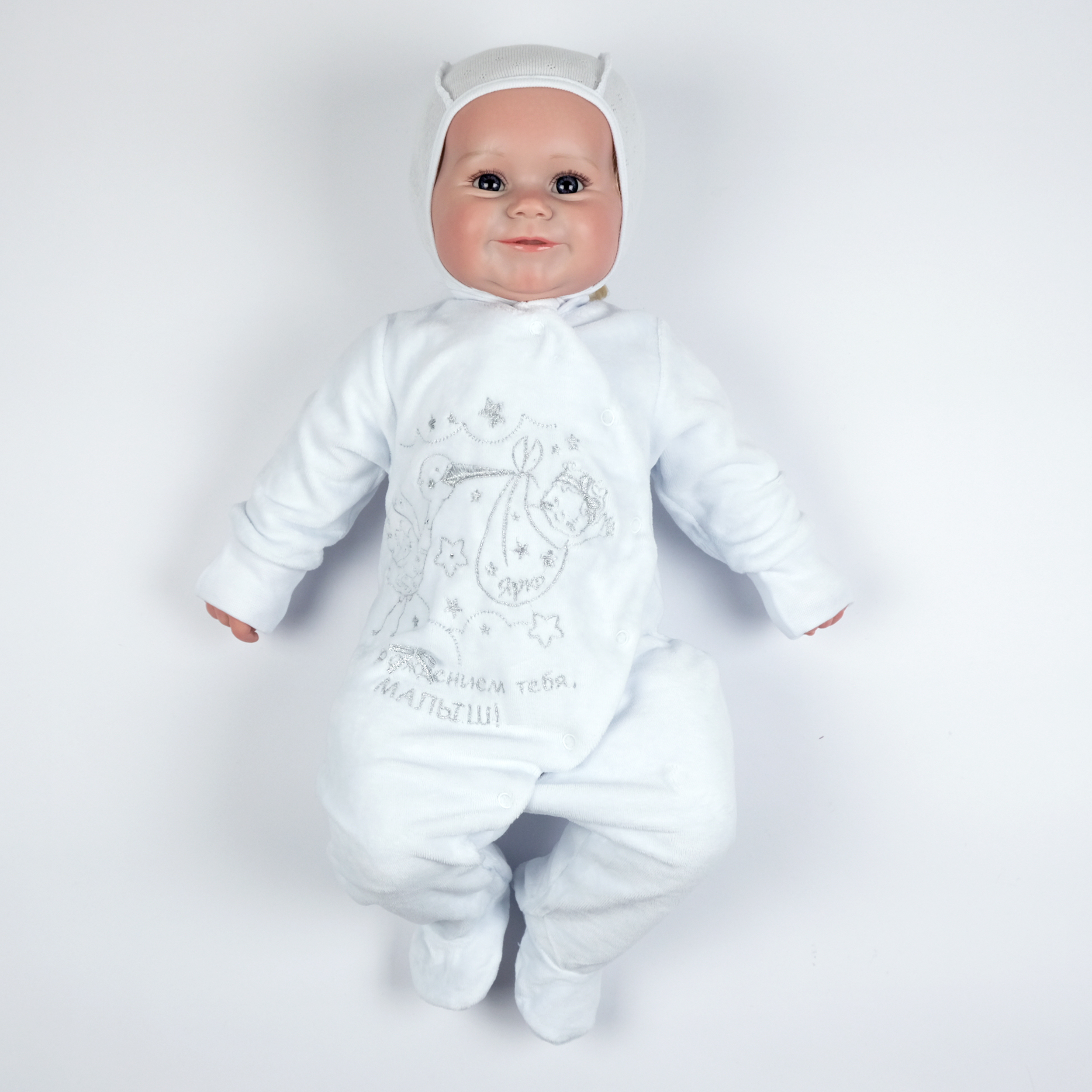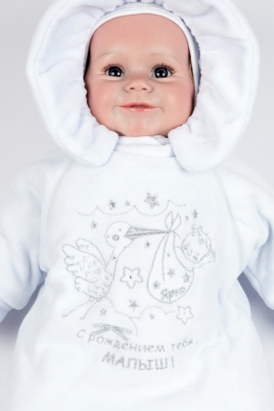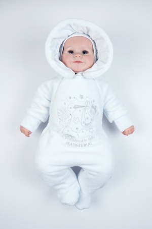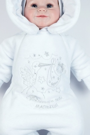 Нарядный комбинезон из велюра на подкладке 100% хлопок, утепленный синтепоном 100гр.. Рукав реглан, заканчивается отворачивающейся рукавчикой, Застегивается на две молнии по реглану, которые уходят в боковые швы. Украшен вышивкой, на нее пришивается бант серебро, и приклеиваются стразы. КомбинезоныЦвет: белый/вышивка девочка, белый/вышивка мальчик