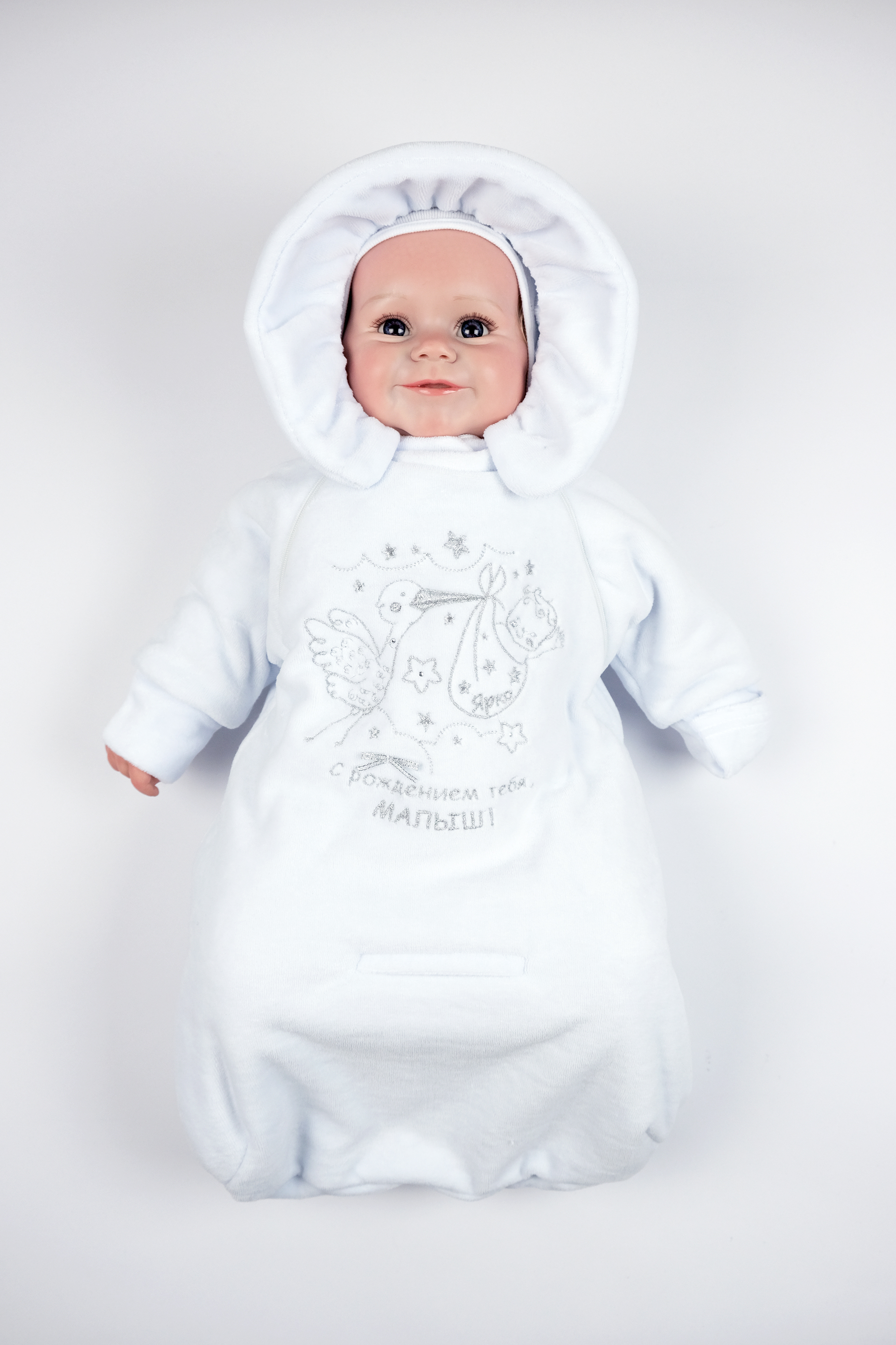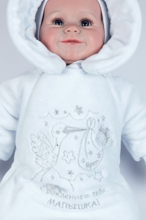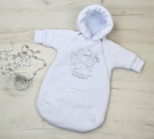 Нарядный комбинезон - конверт из велюра, на подкладке 100% хлопок, утепленный синтепоном 100гр.. Рукав реглан, заканчивается отворачивающейся рукавчикой, Застежка на две молнии по реглану,которые уходят в боковые швы. Конверт украшен вышивкой на нее пришивается бант серебро и приклеиваются стразы. КомбинезоныЦвет: белый/вышивка девочка, белый/вышивка мальчик