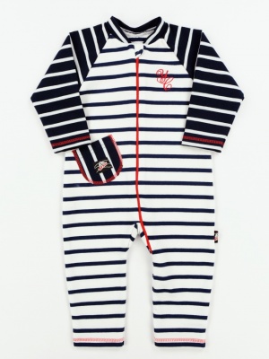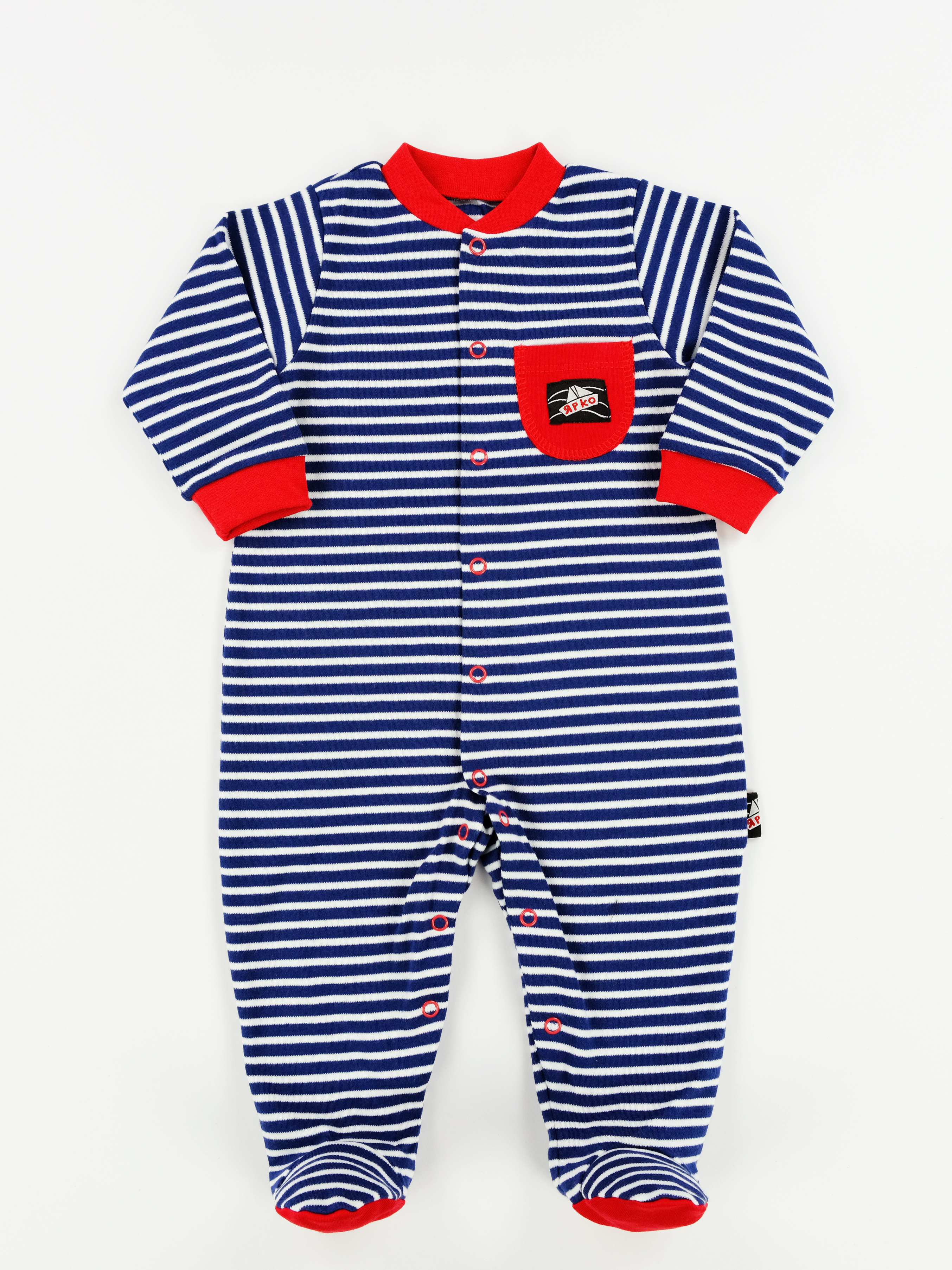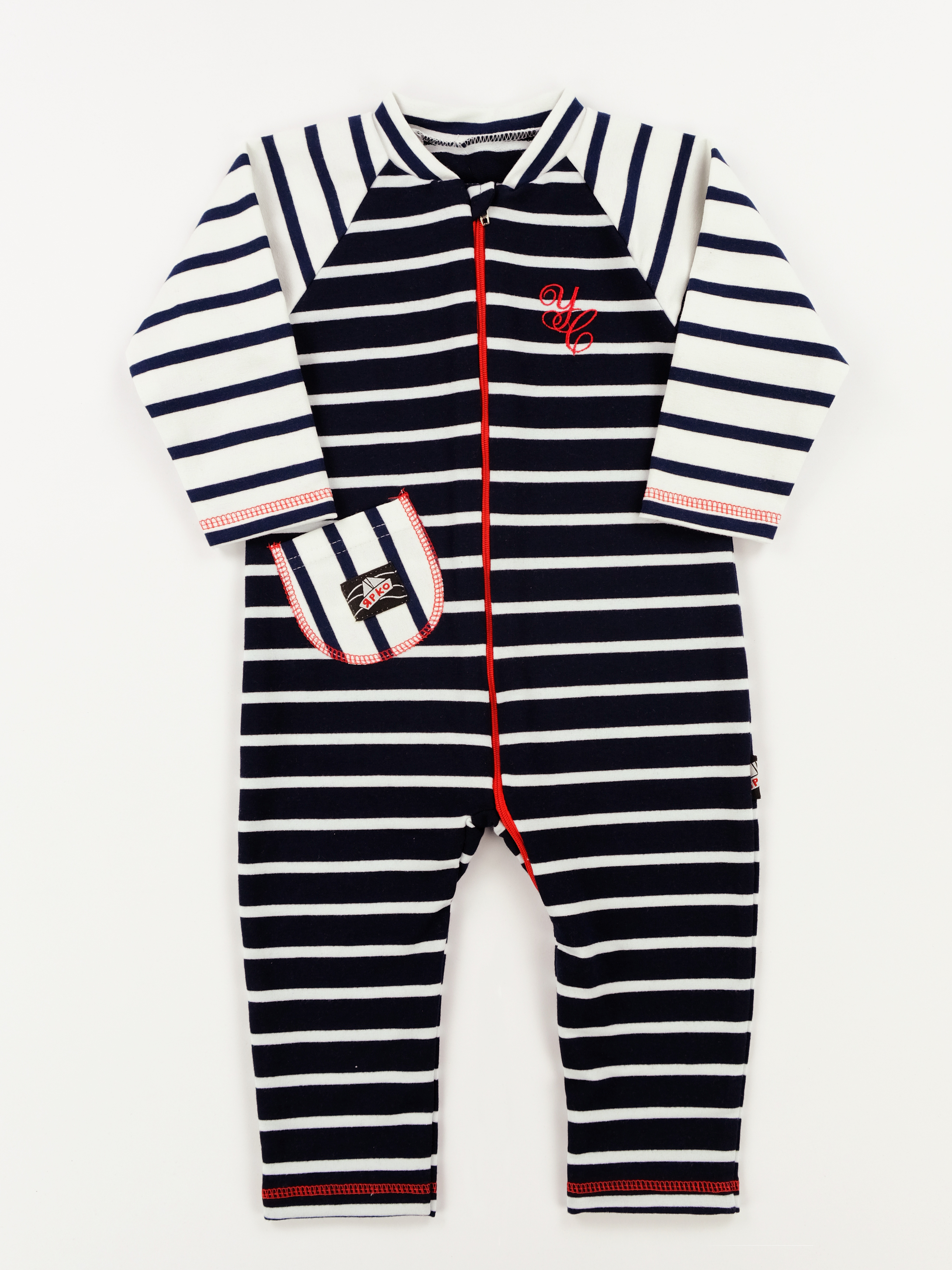 Комбинезон из 2-х ниточного футера с лайкрой свободного силуэта. Рукав длиный покроя "реглан". Застежка спереди на молнию , молния проходит по центру и уходит в шаговый шов в левую штанину. На левой полочке есть вышивка. На правой полочке чуть ниже талии под наклоном настрочен накладной карман На кармане имеется нашивной ярлык" ЯРКО". КомбинезоныЦвет: стан белая полоска на синем/рукава синяя полоска на белом, стан синяя полоска на белом/рукава белая полоска на синем