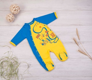 Комбинезон из кулирного полотна, свободного силуэта, выполнен швами на лиц.сторону. Рукав длинный, покроя "реглан", низ рукава заканчивается круглой рукавичкой. Застежка спереди ассиметричная на кнопки. Большая полочка украшена печатью. КомбинезоныЦвет: 62 желтый/рукава бирюза, бирюза/рукава желтый