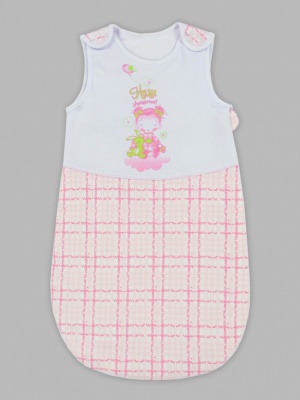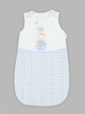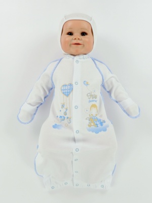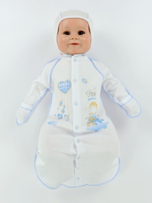 Уютный комбинезон-конверт из трикотажного полотна - интерлок, на синтепоне 60 грамм и на подкладке из трикотажного полотна 100% хлопок. Застежка очень удобная, ведь можно быстро уложить ребенка в конверт, полностью расстегнув кнопки в плечах и молнию в боковом шве. Изделие украшено печатным принтом.
