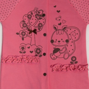 Комбинезон из кулирного полотна 100% хлопок, свободного силуэта. Рукав длинный покроя "реглан". На верхней части комбинезона пришиты оборки. Застежка спереди на кнопки, переходит в шаговые швы. На первой кнопке пришит бантик из атласной ленты. КомбинезоныЦвет: представлен на фото