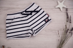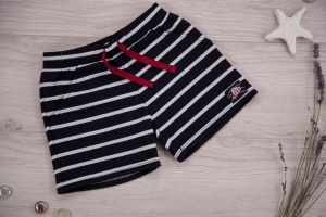Шорты для девочки из 2-х ниточного футера. Шорты А-силуэта силуэта.Передняя и задняя половинка со средними швами. На передних половинках есть карманы. В пояс вставлена киперная лента. В боковом шве на уровне бедра вшивается вшивной ярлык "Ярко". По низу шорт на левой стороне пришита нашивка. Брюки, шорты, полукомбинезоныЦвет: полоска синяя на белом