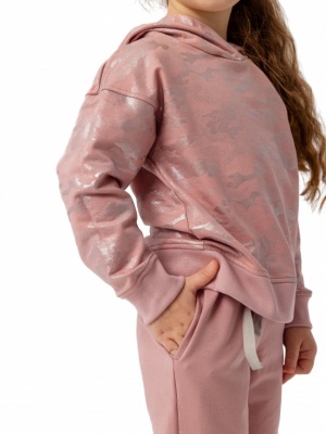 Костюм для девочек из 2-х ниточного петлевого футера. Худи из футера с легким серебристым рисунком "камуфляж". Худи с большим капюшоном и спущенным рукавом придают изделию свободу и комфорт. Удобные штанишки с карманами в боках и на резинках по низу изделия. Пояс с декоративным шнуром из киперной ленты "серебро".